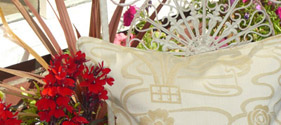The Roman Blinds tie in beautifully with the personality of this home and their unusual lengthened design allows for the fabric to give a wall hanging effect over alcove windows. Bolster cushions were created with delicate beaded trimming to heighten the colour scheme in this room.